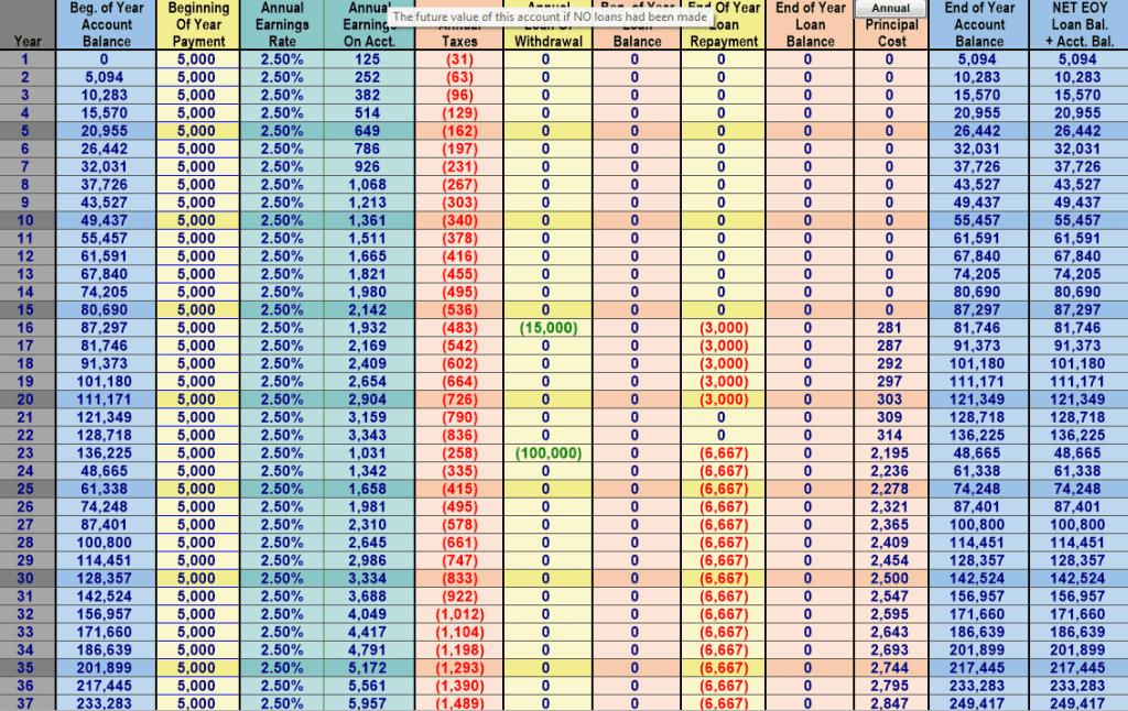 What I am NOT showing, or comparing, is different investment opportunities. I am strictly comparing two savings options. Comparing a savings option to an investment option would be comparing apples and oranges. But it is important to note that you may indeed want some portion of the capital you are accumulating for your child, or yourself, to be in investments that have a higher risk profile that may also prove to provide higher returns. But it is important to note that by practicing IBC, you can do both without hindering one or the other, you generally can’t do this with any other savings vehicle. So, if you want to put your capital into investment opportunities like Real Estate, or speculative opportunities like equities, option trading etc., you can still do so via an IBC policy—not so with a HYS account.