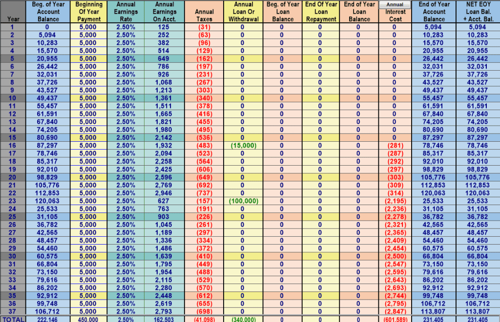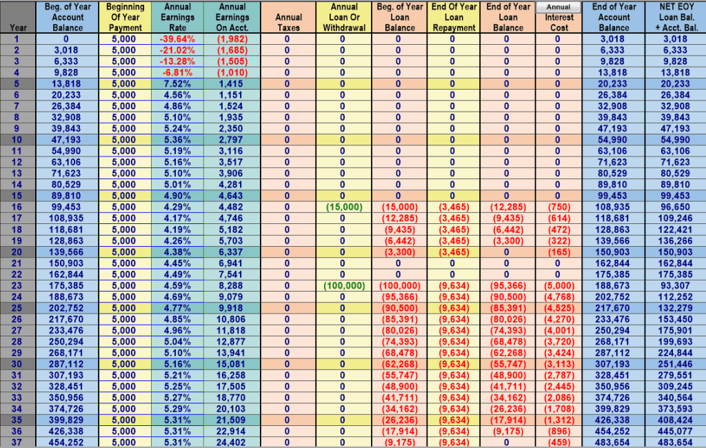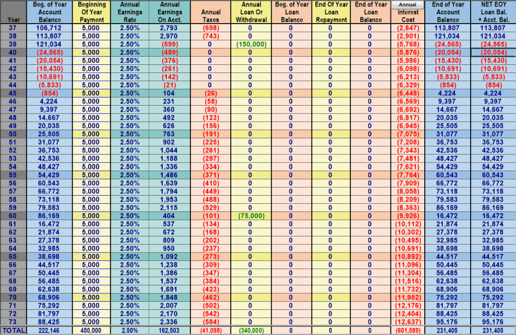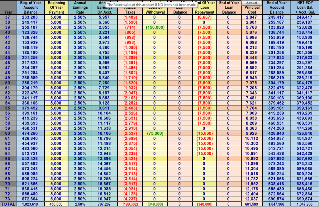 So for this next example I will show the WL with loans, but with NO loan repayments. We are just letting the loans compound (which in the real world we would almost certainly never do except in specific situations that were planned for—like retirement, or a short term policy loan, less than a year, to fund say a RE flip etc.—and usually you would at least pay the interest on the loans so there was no compounding of the loan balance, which would make a significant difference on these numbers as the loan balance would remain flat).